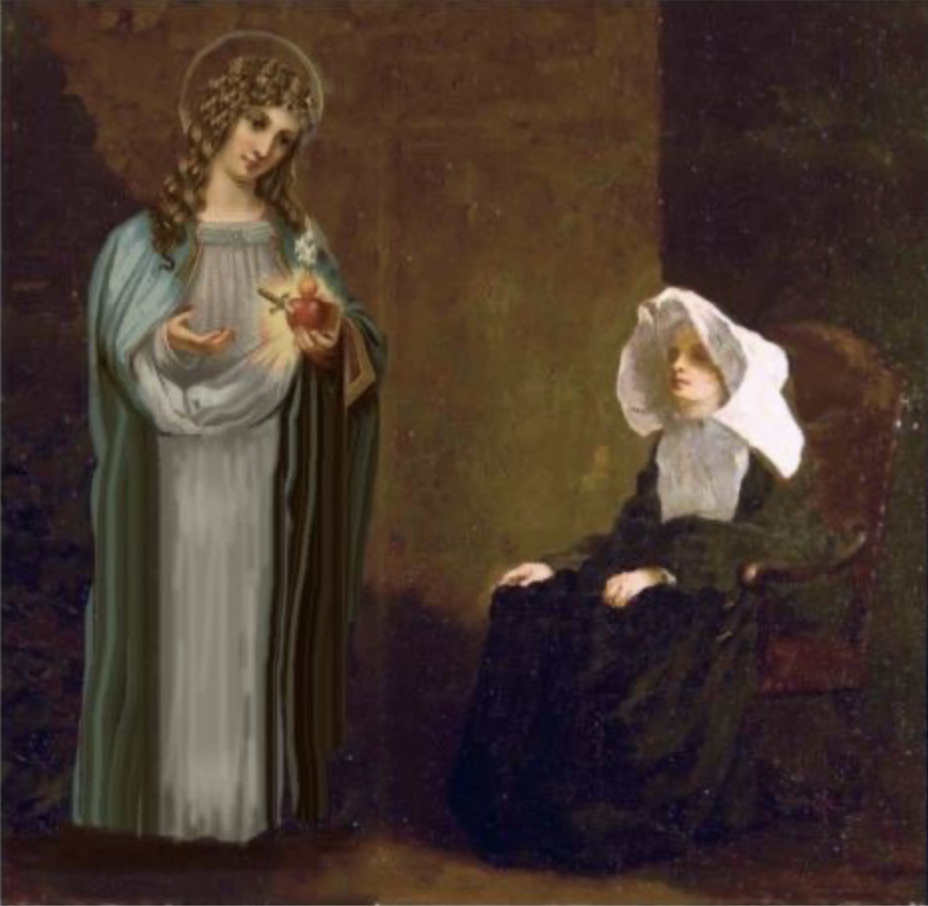 This silent visit would reoccur five to six times over the course of the following months, on the principal feasts of the Blessed Virgin. They culminated on the September 8, 1840, the Feast of the Nativity of Mary: during meditation, the Blessed Virgin once again made herself visible to little Justine. This time, however, she held her Immaculate Heart in one hand, and in the other, the green scapular. Justine heard an interior voice. She was made to understand that this scapular, and the holy picture it bore, was to lead to the conversion of many souls, and to secure for those souls saving graces at their death. Copies were to be made without delay, and to be distributed with confidence.